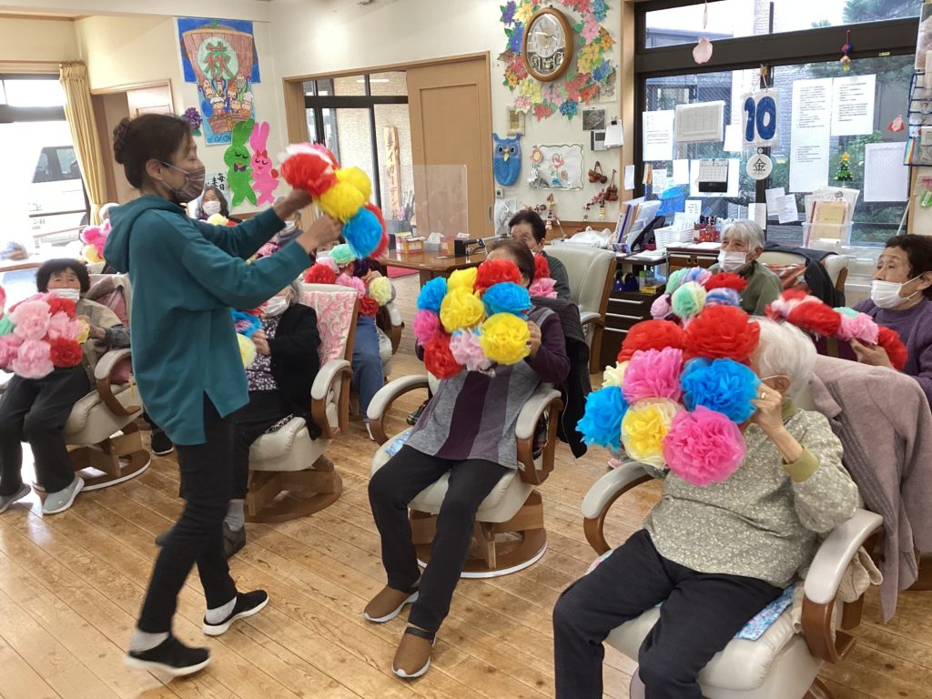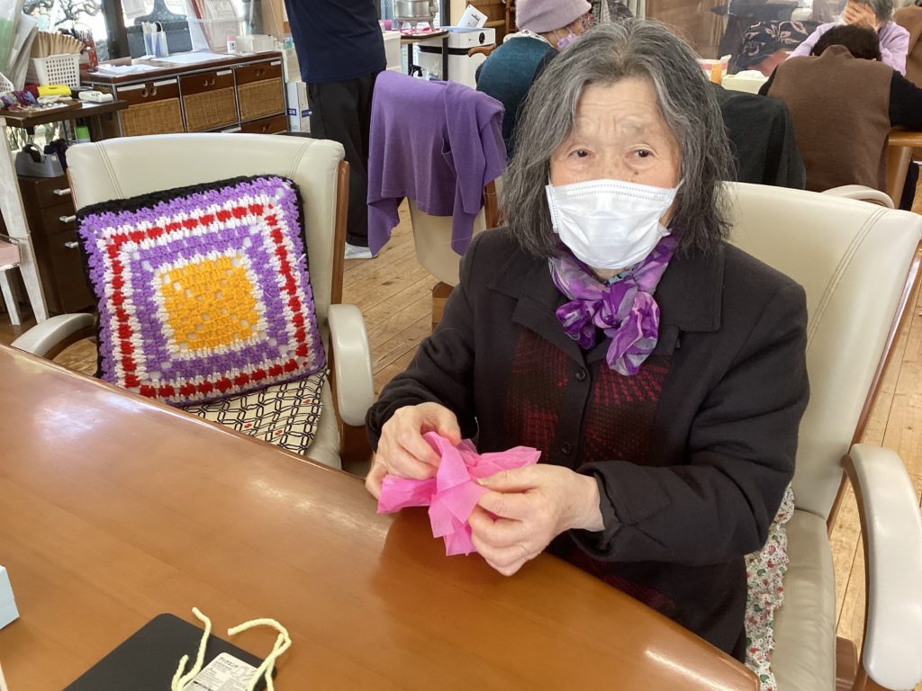 全て一人で作り上げるのは難しいので、時々職員も手伝いながら奇麗な花笠を作ることができました\(^o^)/