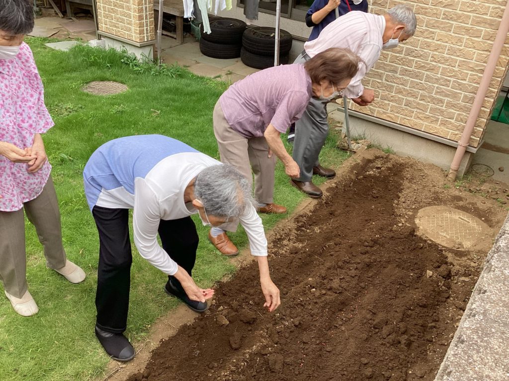 しっかり収穫できることをご利用者の皆様と一緒に願って…種まき記念に畑の前で写真を撮りました☺