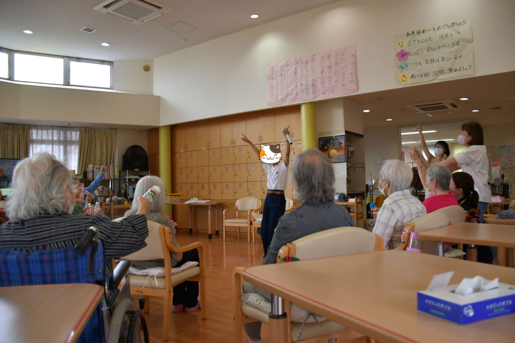 応援グッズを片手に、ご利用者様もスタッフも一緒に⤴、「Haーーーーーー!!」