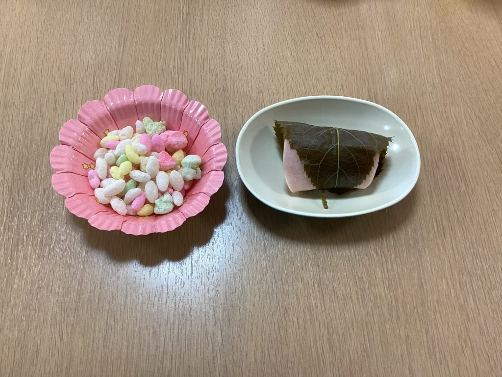 「ゆかり大原」に帰ってきた後、春を感じていただこうと用意した桜餅とひなあられをご利用者の皆様でいただきました。