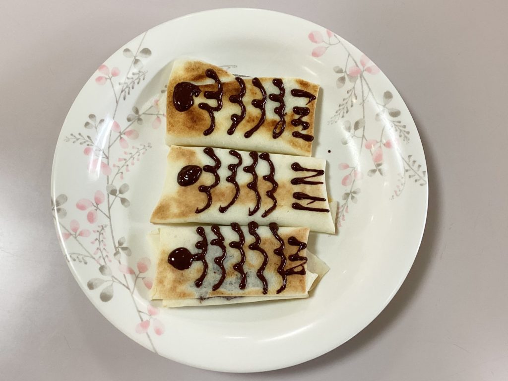 バナナと板チョコを細かくして春巻きの皮に巻いて、ホットプレートで焼いて、少し冷ましてからチョコペンで目と模様を書いて完成です(^^)/