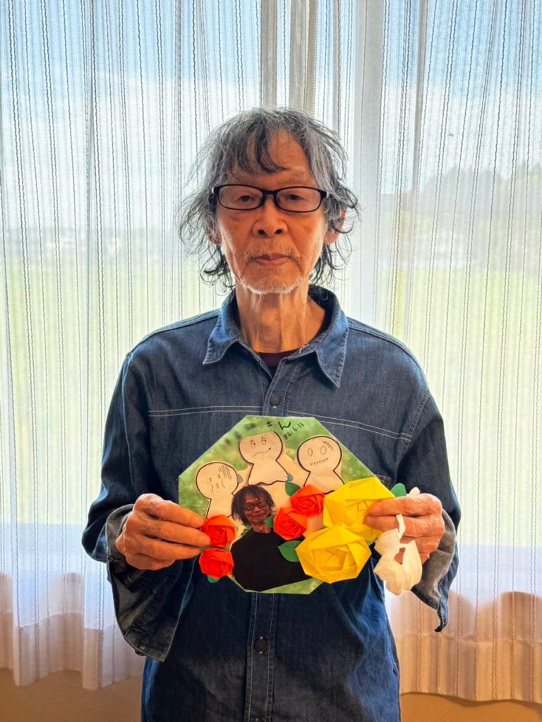 今回は、父の日に、男性のご利用者様に、日頃の感謝をお伝えするとともに、職員手作りの折り紙で作成したお花と似顔絵をプレゼントしました。
