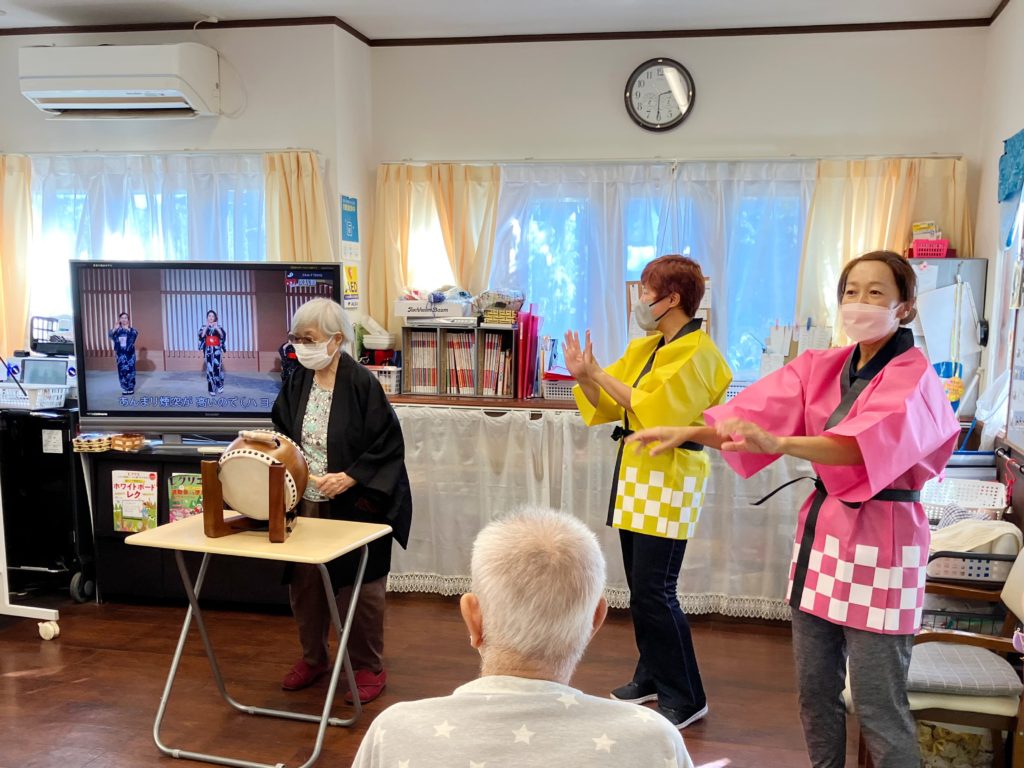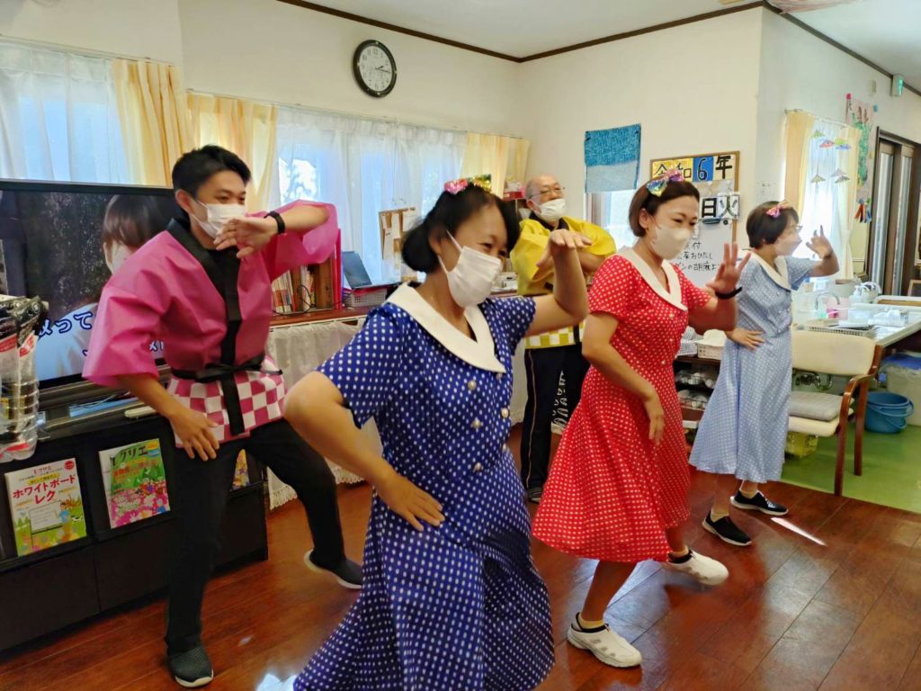 「東京ブギウギ」の踊りのあとはご利用者様もよくご存じのドリフターズの「ビバノン音頭」をご利用者の皆様と一緒に歌いました。