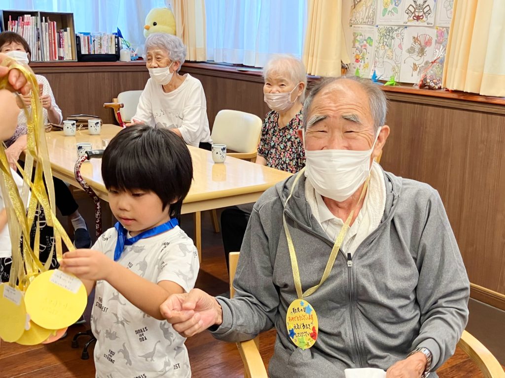 この日は、まだ保育園に通っている子のいる職員が親子で作ってくれたメダルを、子どもたちの手からご利用者の皆様にお渡ししてくれました。