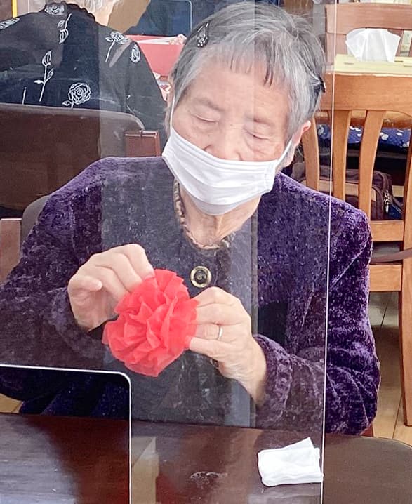 お花紙で赤いお花をたくさん作り…