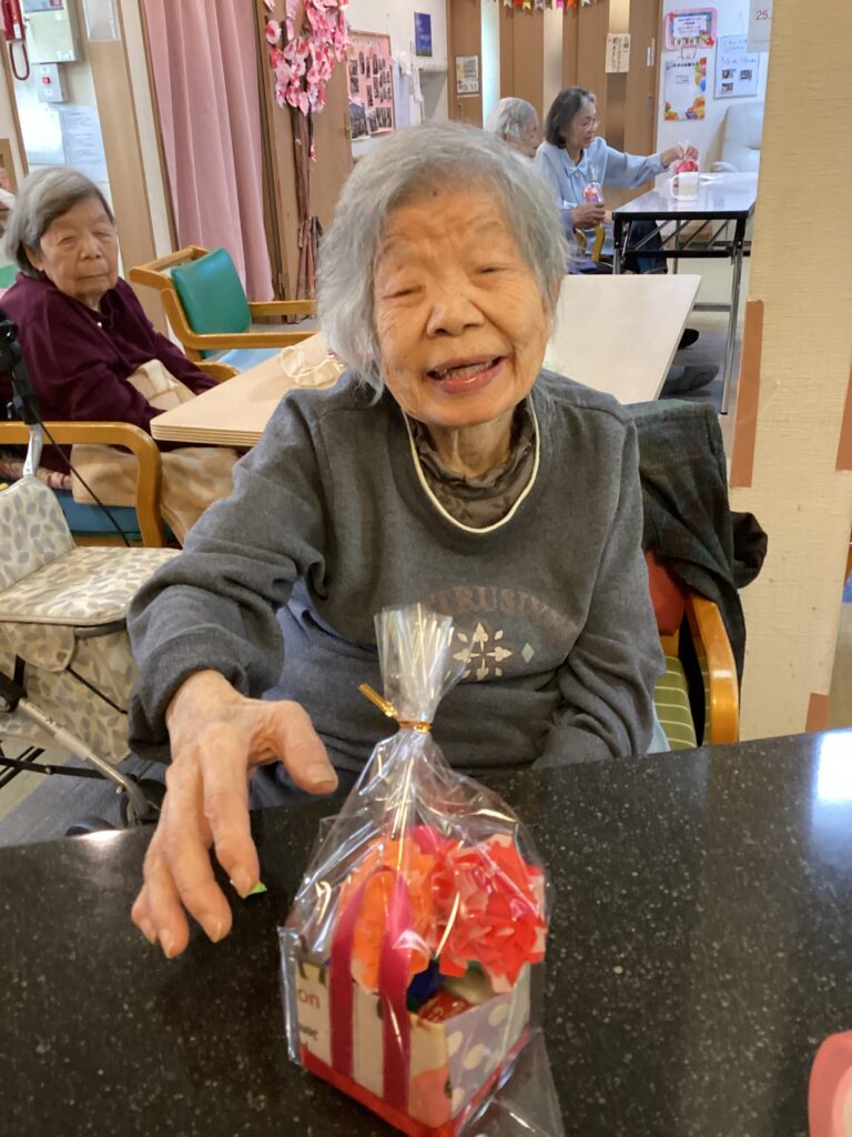 大先輩のお母様方に日頃の感謝を込めて、職員手づくりのカーネーションの花かごを送らせていただきました。かごは、ご利用者様にも手伝って頂き、思い思いの花かごになりました。