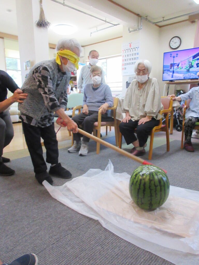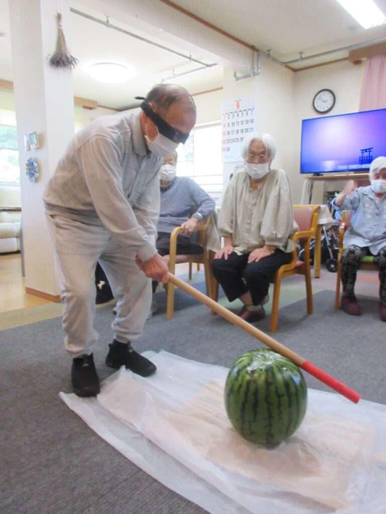 職員からの差し入れで、大きなスイカを持ってきてくれたので、2日にわたってスイカ割りを行いました🍉