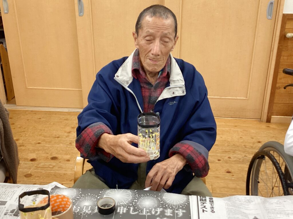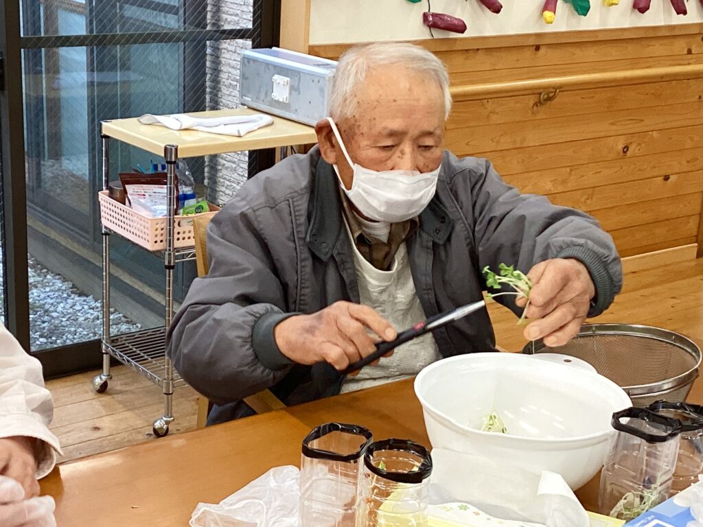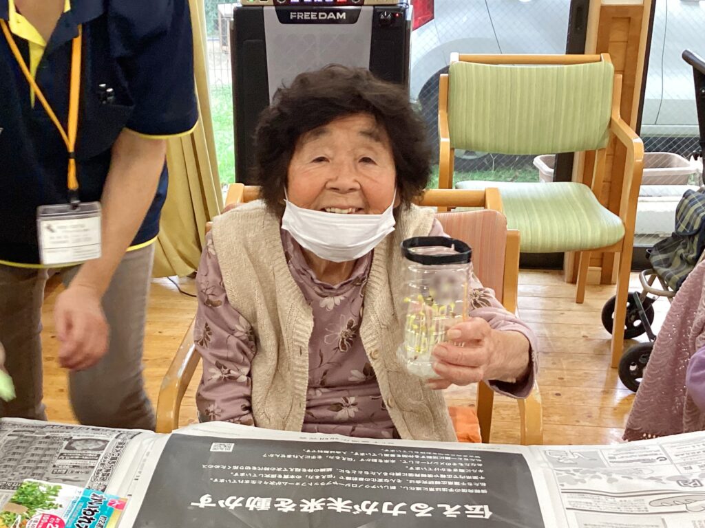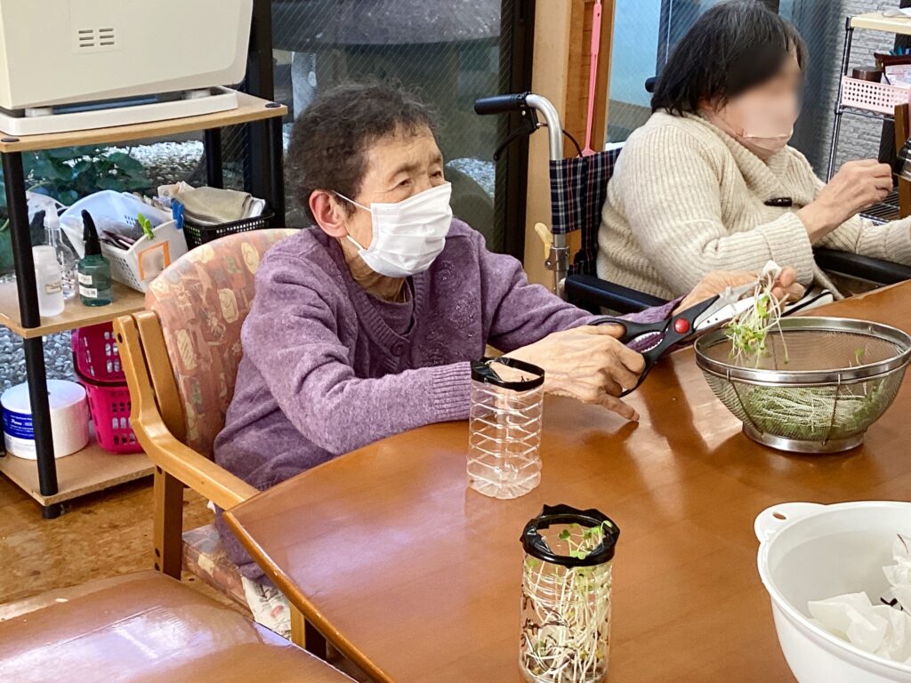 今回、壱番館では【園芸レクと皆様が育てたかいわれ大根の収穫】を行いましたので、ご様子を紹介します(^^)
