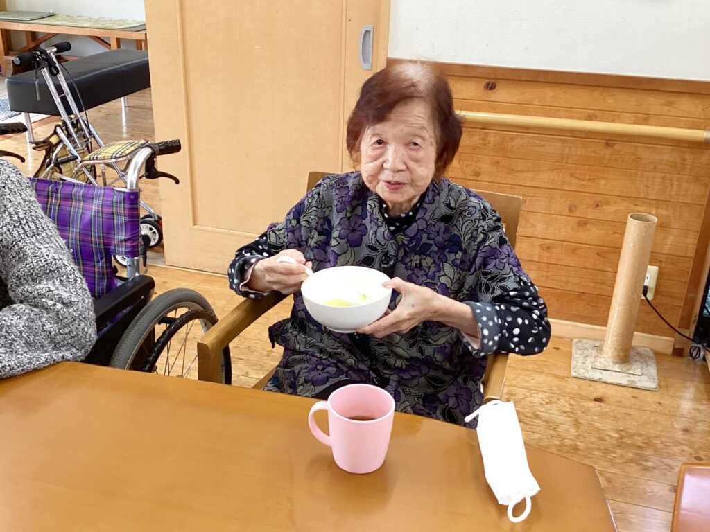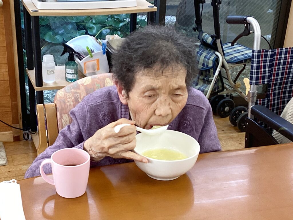 畑から戻ったらおやつとして「卵とかいわれ大根のスープ」を召し上がられました!!