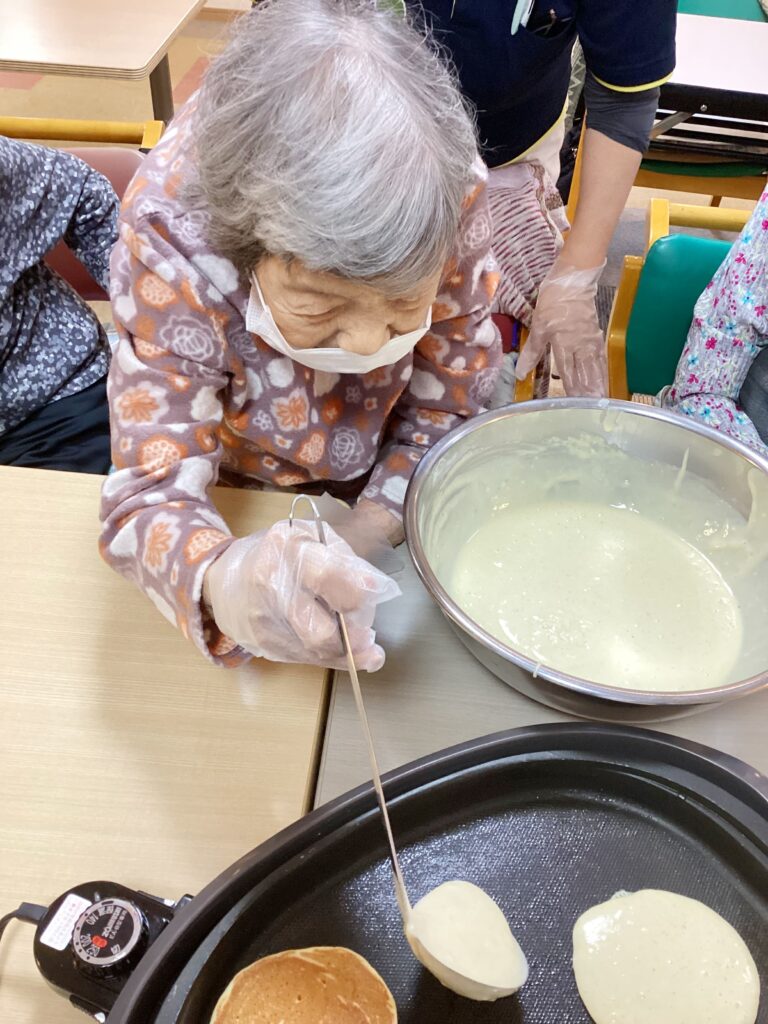 今回は、抹茶のクリーム入りどら焼きを、ご利用者の皆様と一緒に作りました。