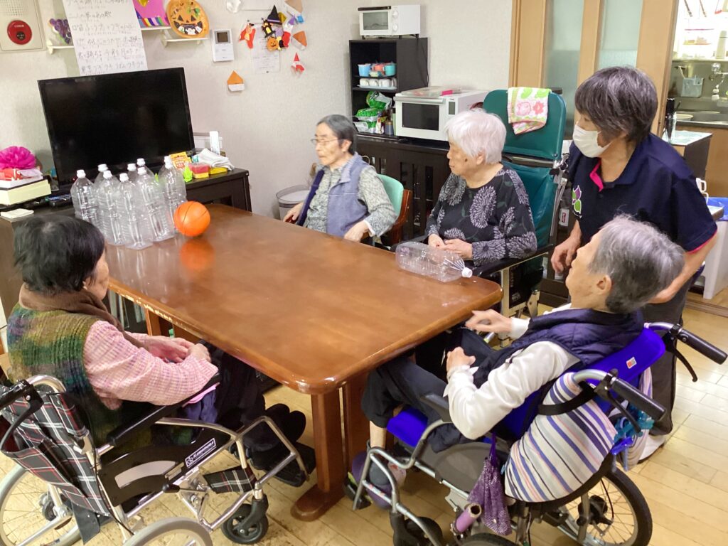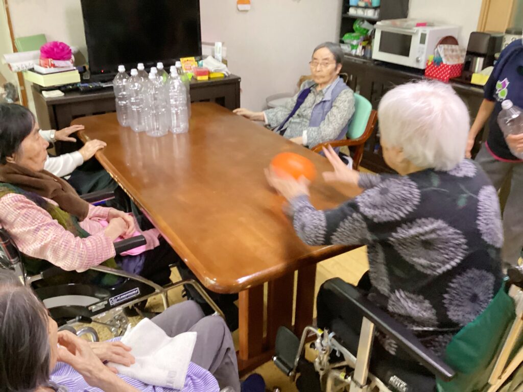 ペットボトルをピンに、玉はゴムボールを使用しました。