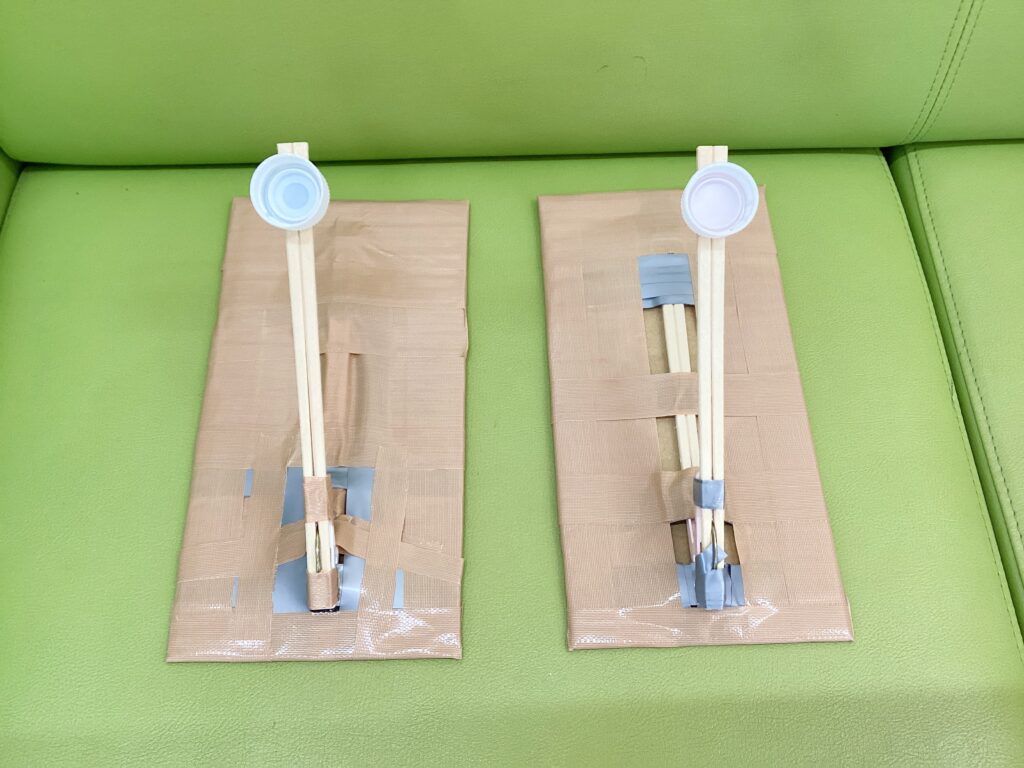 段ボールと割り箸、ペットボトルのフタと洗濯ばさみがあれば投石機のような発射台を作れます♪