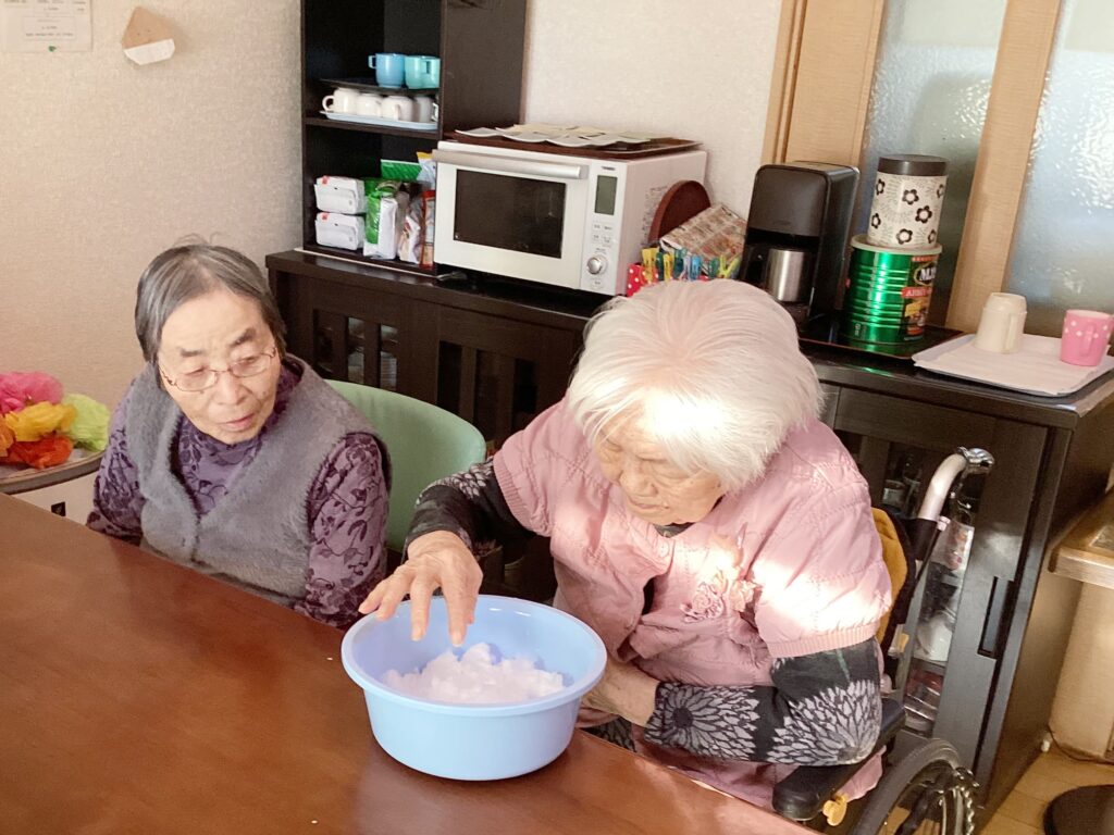 職員が桶に雪を入れてきて、ご利用者の皆様に触れていただきました。冷たい雪の感触はいかがだったでしょうか?
