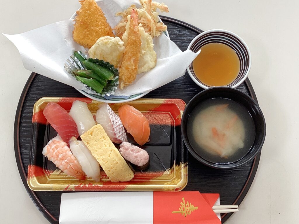 お昼にお寿司とフライ、天ぷらを準備していつもより豪華な食事会です!