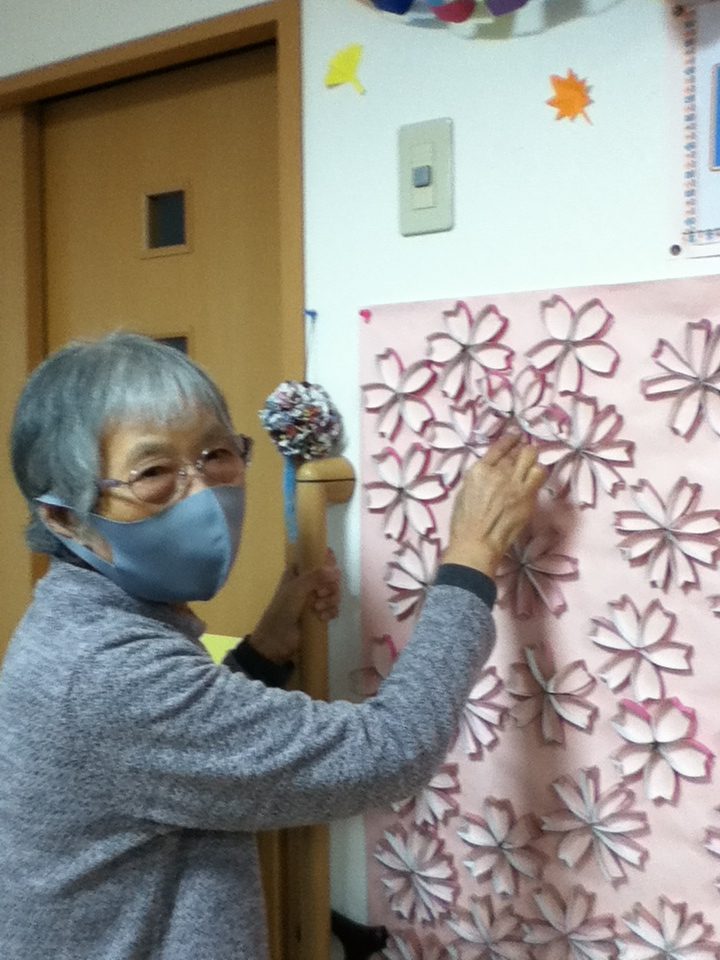 桜の季節がやってくるので、「グループホーム」で桜の壁画を皆で作りました!(^^)!